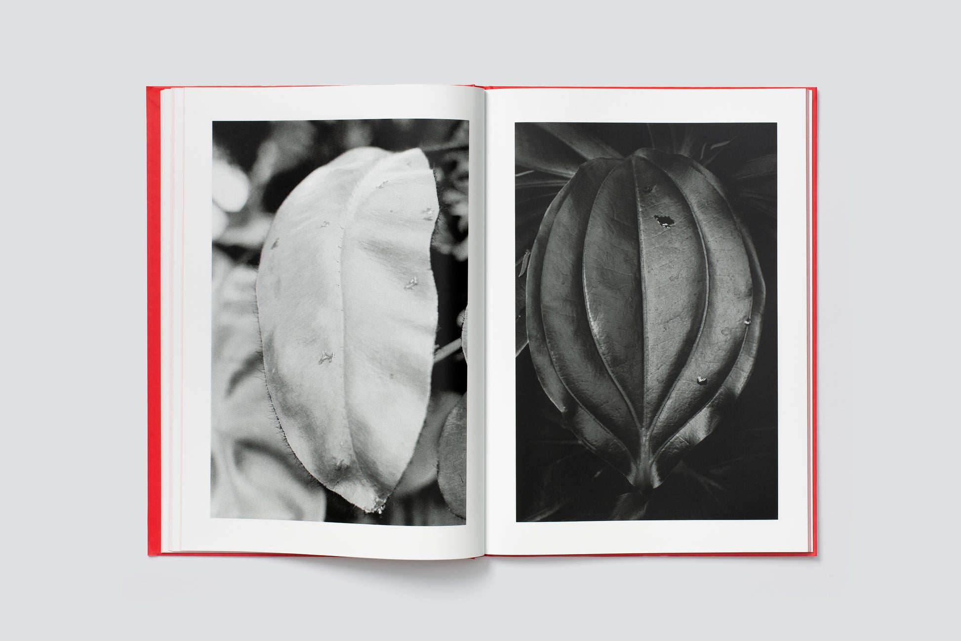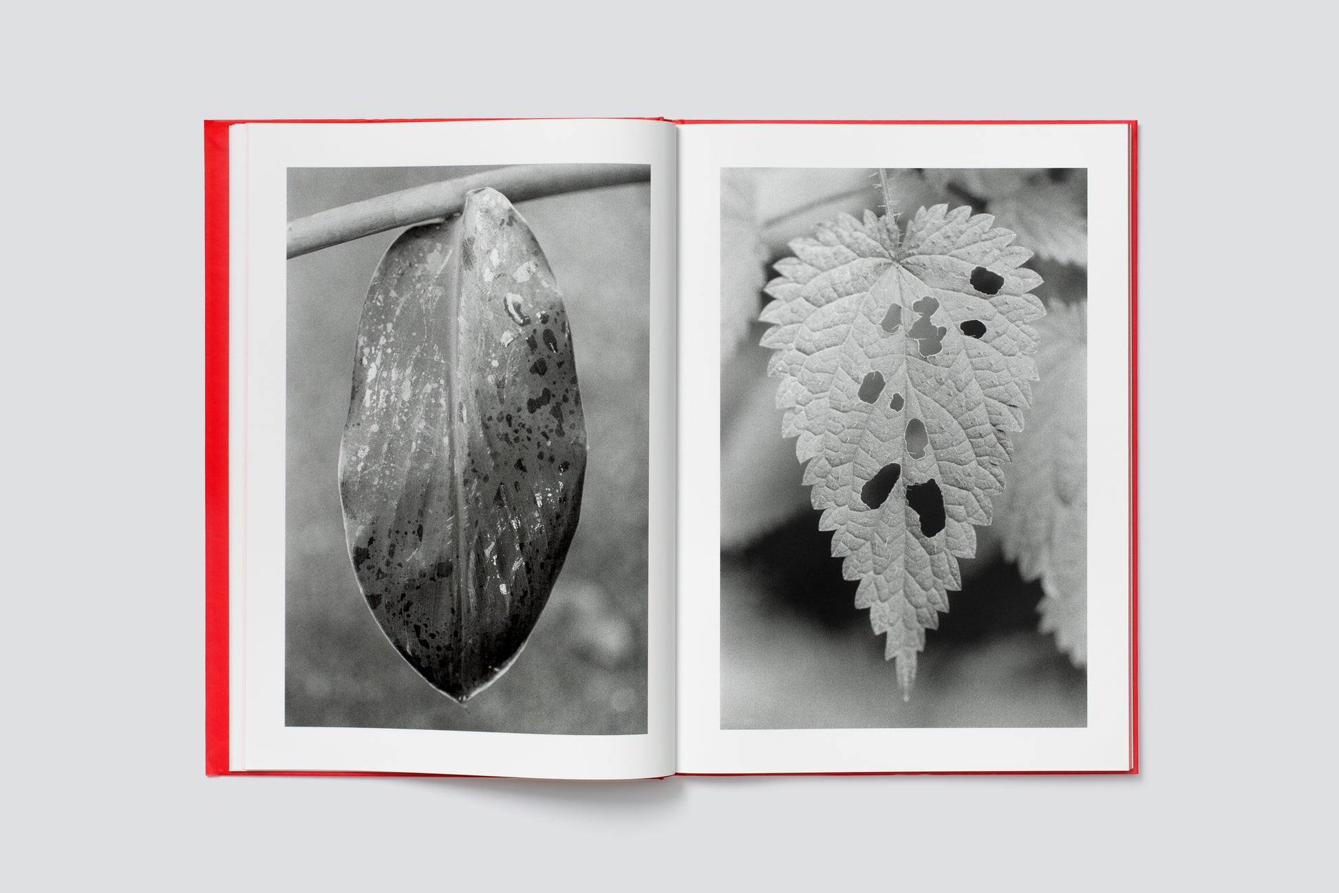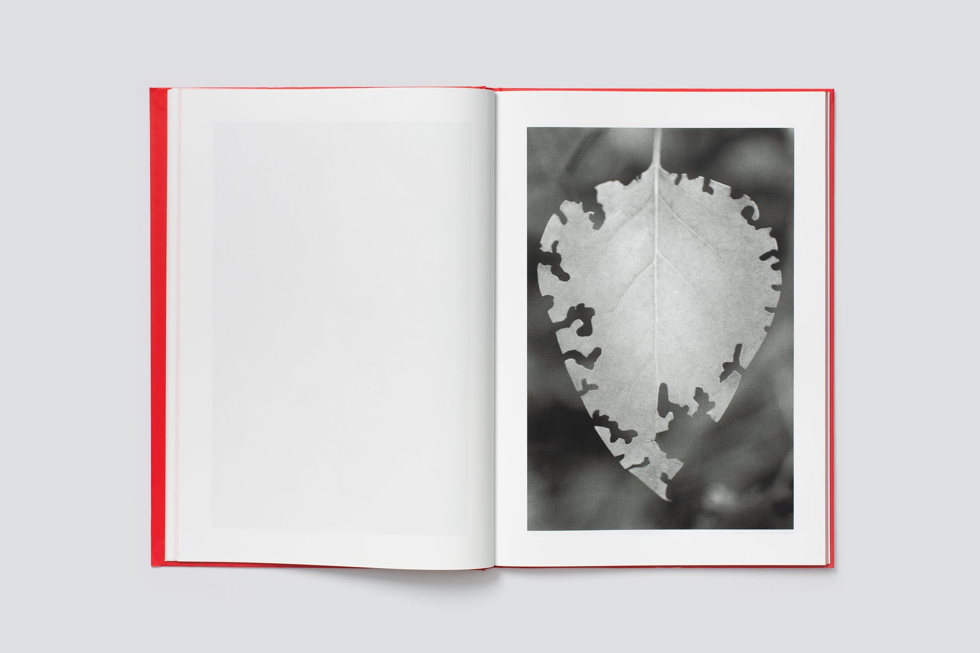 In the publication ACTINISM, the image format deviates little or not at all from the original size of the prints. As a result, the viewer is very close to the image. Light-dark contrasts and gray tones of the baryta paper can be seen in all their nuances. The leaves are either on a single page or partially juxtaposed. The result is a condensation in which the leaves come together in their multifaceted essence, manifesting the artist’s intention to show the motifs as subjects.
