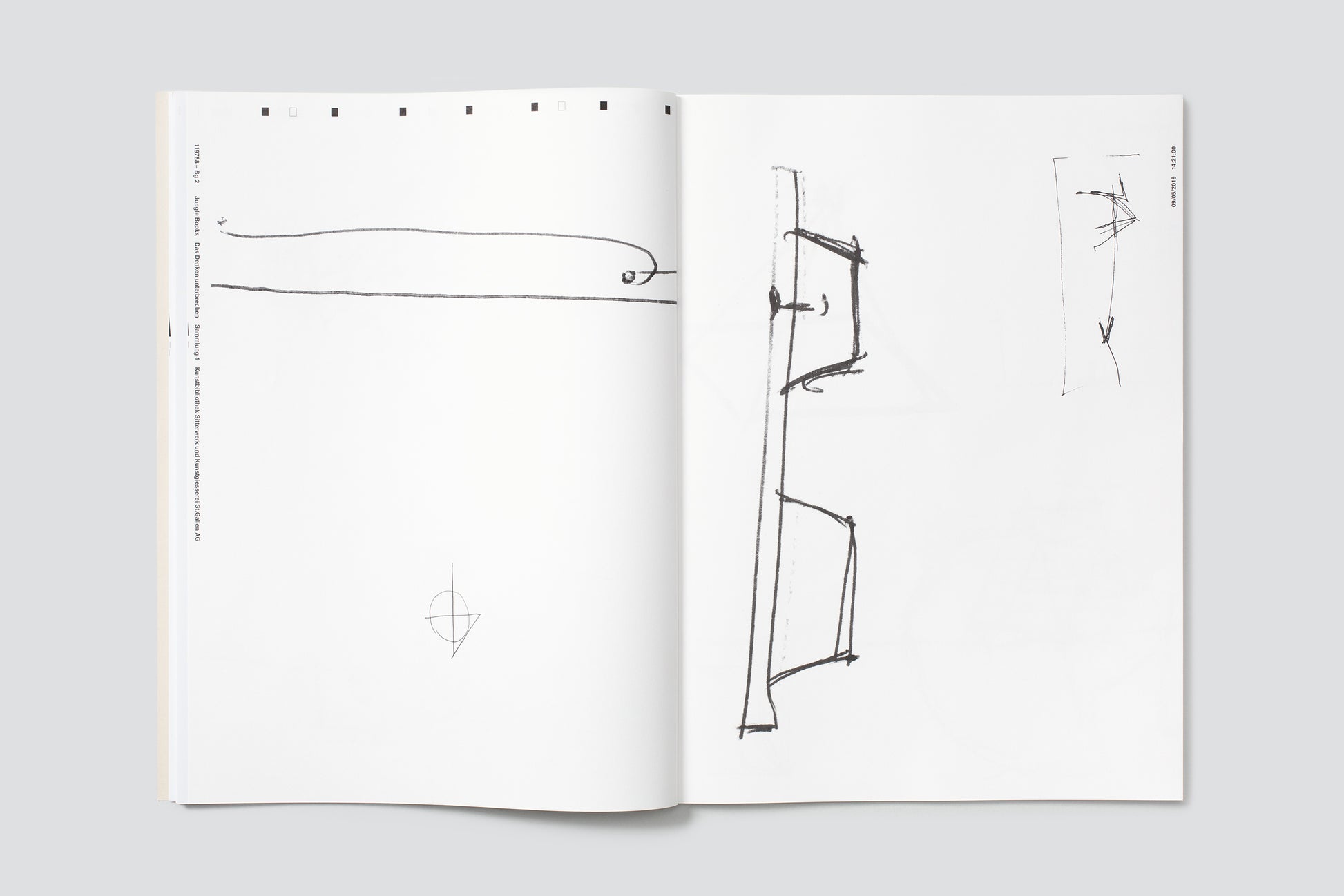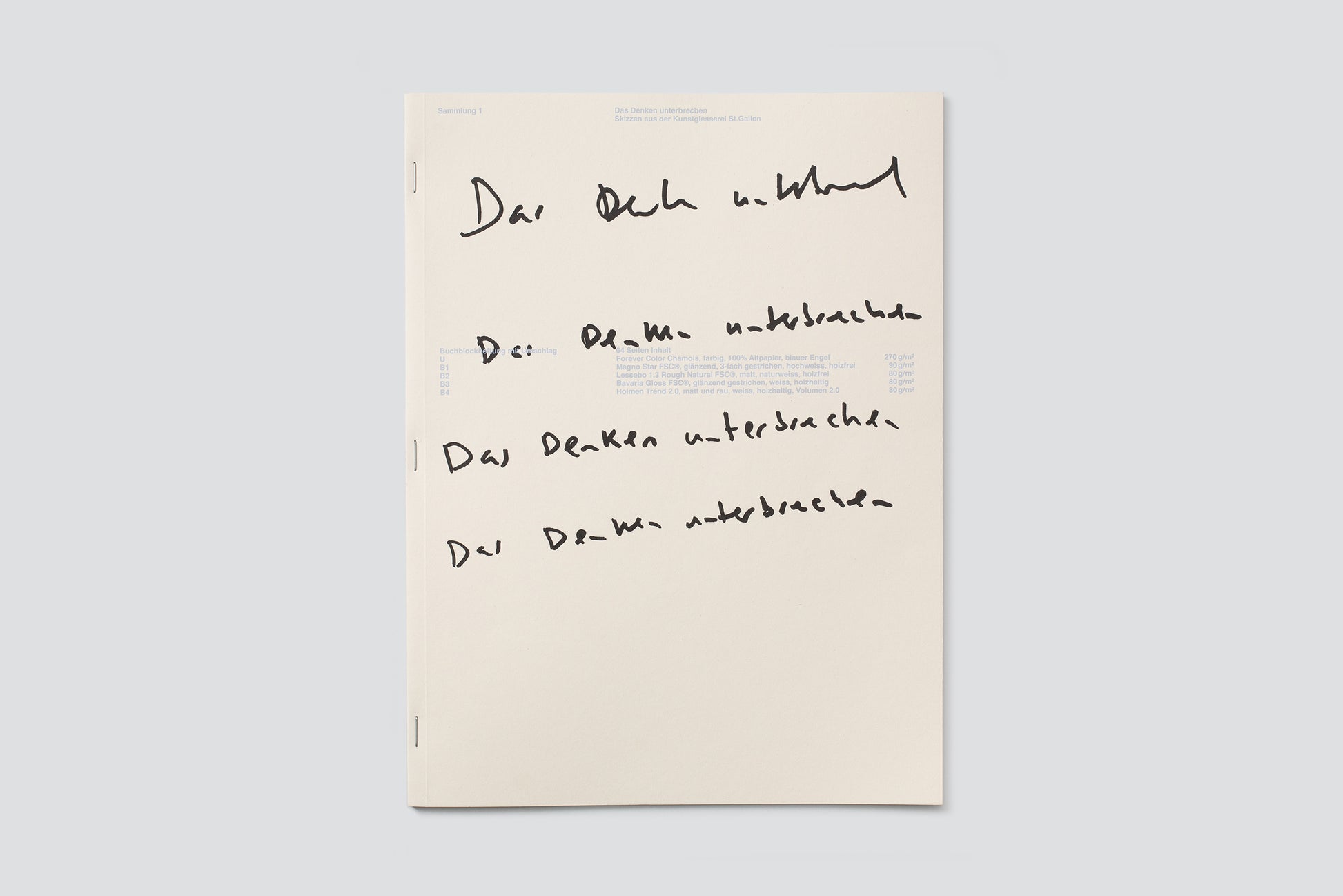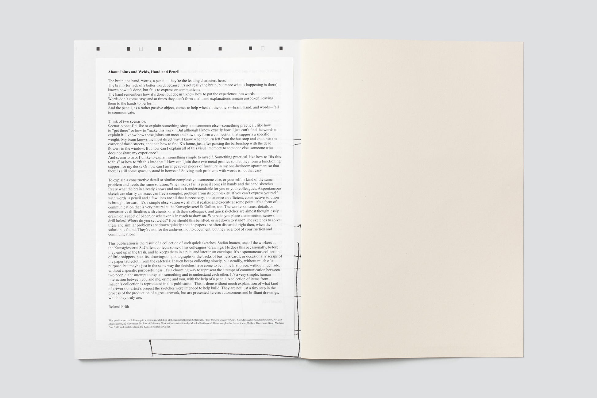 This publication is a follow-up to a previous exhibition at the Kunstbibliothek Sitterwerk, “Das Denken unterbrechen”: Eine Ausstellung zu Zeichnungen, Notizen, Ideenskizzen, 22 November 2015 to 14 February 2016, with contributions by Monika Bartholomé, Hans Josephsohn, Sarah Klein, Mathew Kneebone, Karel Martens, Paul Stiff, and sketches from the Kunstgiesserei St.Gallen. The publication was made possible with the generous support of Innerrhoder Kunststiftung and Kulturförderung der Stadt St.Gallen.
