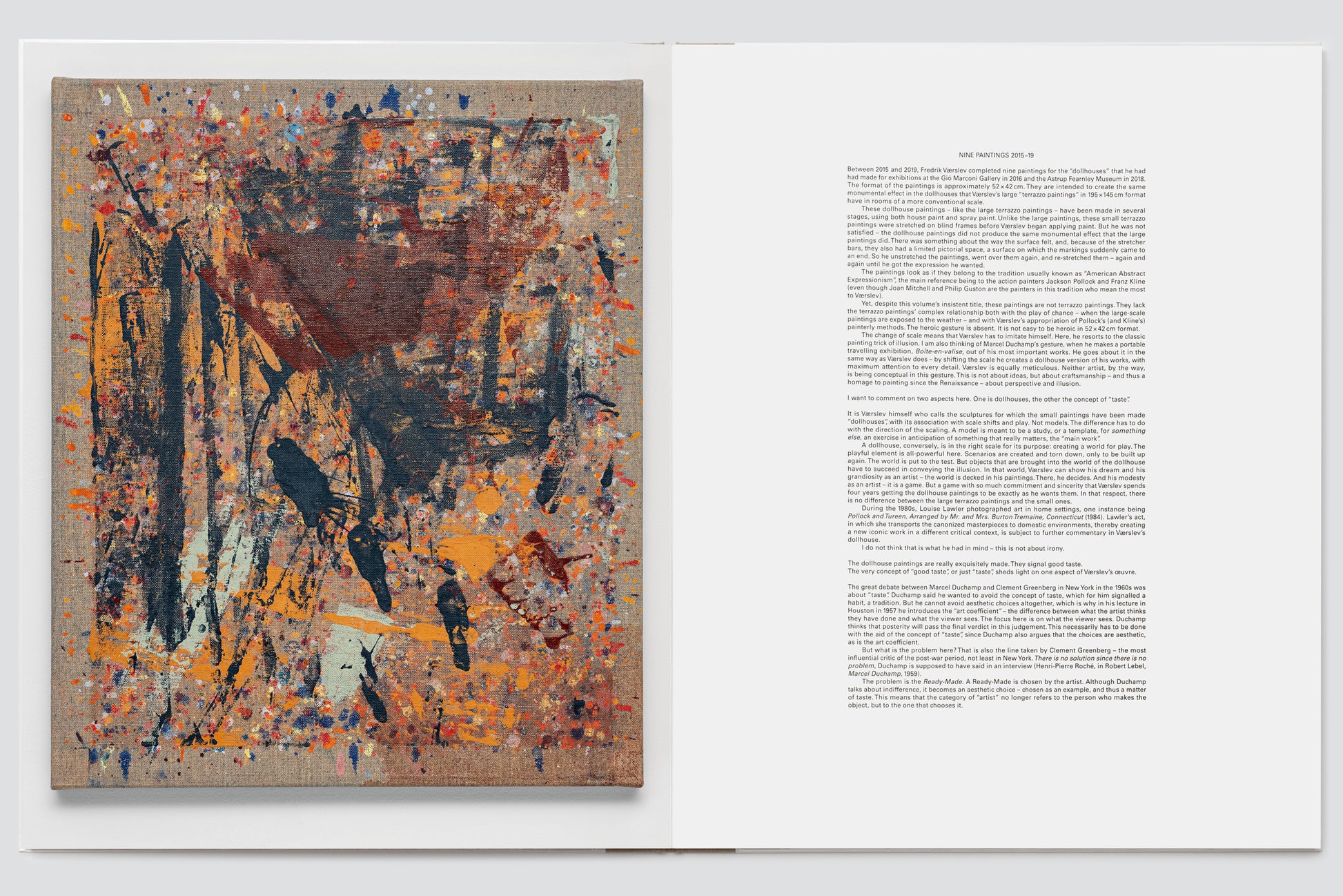 A key aspect of the book is an in-depth essay by Gertrud Sandqvist, a well-known writer and art historian, who situates Værslev’s practice within a broader historical and theoretical context. She draws connections between his approach and movements such as American Abstract Expressionism, referencing artists like Jackson Pollock, Franz Kline, and Philip Guston, while also considering the significance of scale shifts in his work. Sandqvist discusses how Værslev’s dollhouse paintings, originally conceived for miniature architectural settings, mirror the strategies of Boîte-en-valise, Marcel Duchamp’s portable museum, where artworks are reproduced in reduced dimensions to create a self-contained world.