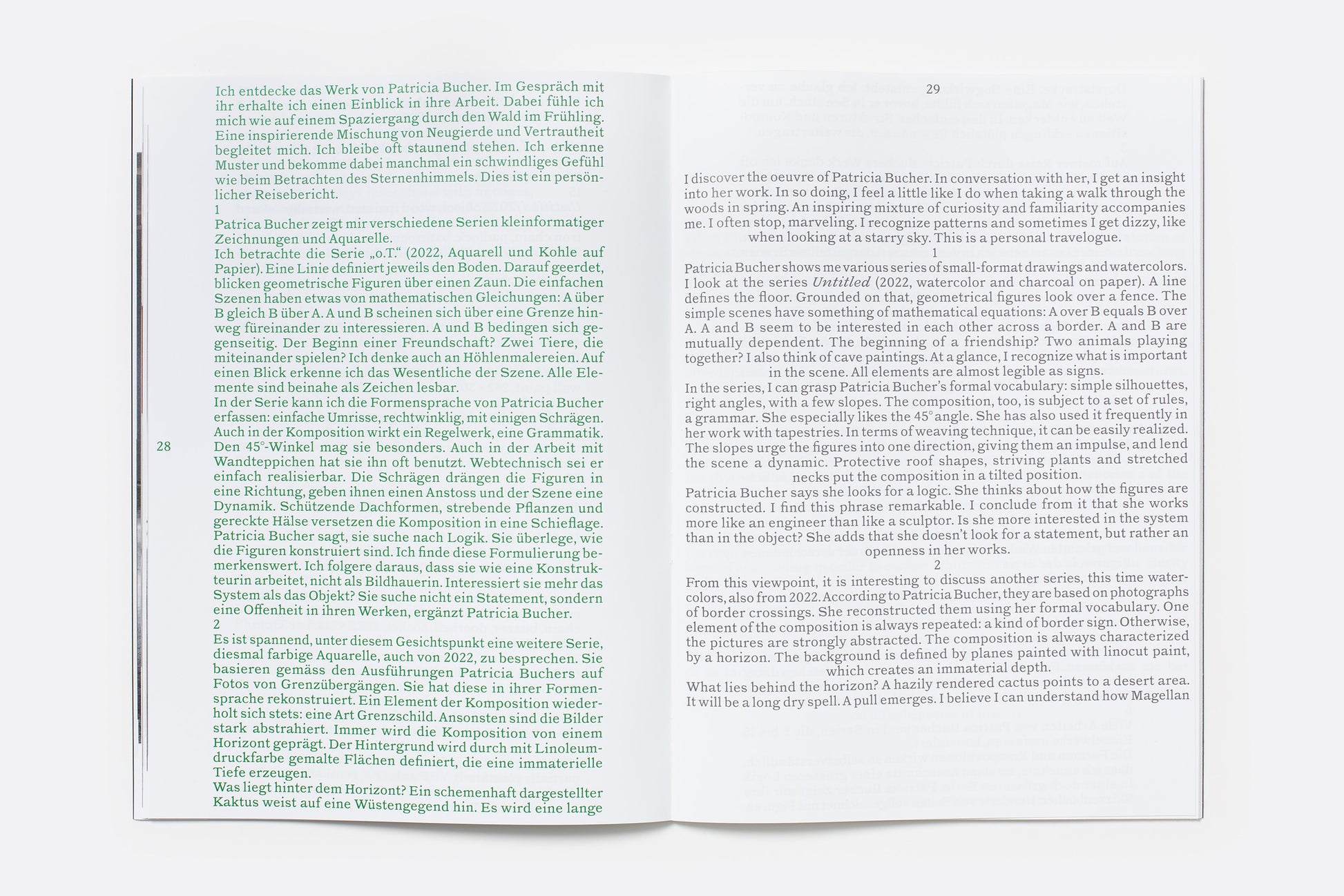 Claudius Fruehauf (Lausanne) wrote the text for Patricia Bucher’s Cahier. He holds a degree in Architecture from ETH Zurich (2007). In 2008, he founded the architectural firm FHV Architekten – FRUEHAUF, HENRY & VILADOMS – in Lausanne. Previously, he worked as an assistant scenographer for Herzog & de Meuron in 2005–2006 and 2009–2010. In 2008, he worked as an architect for architectural firm Herzog & de Meuron in Basel.