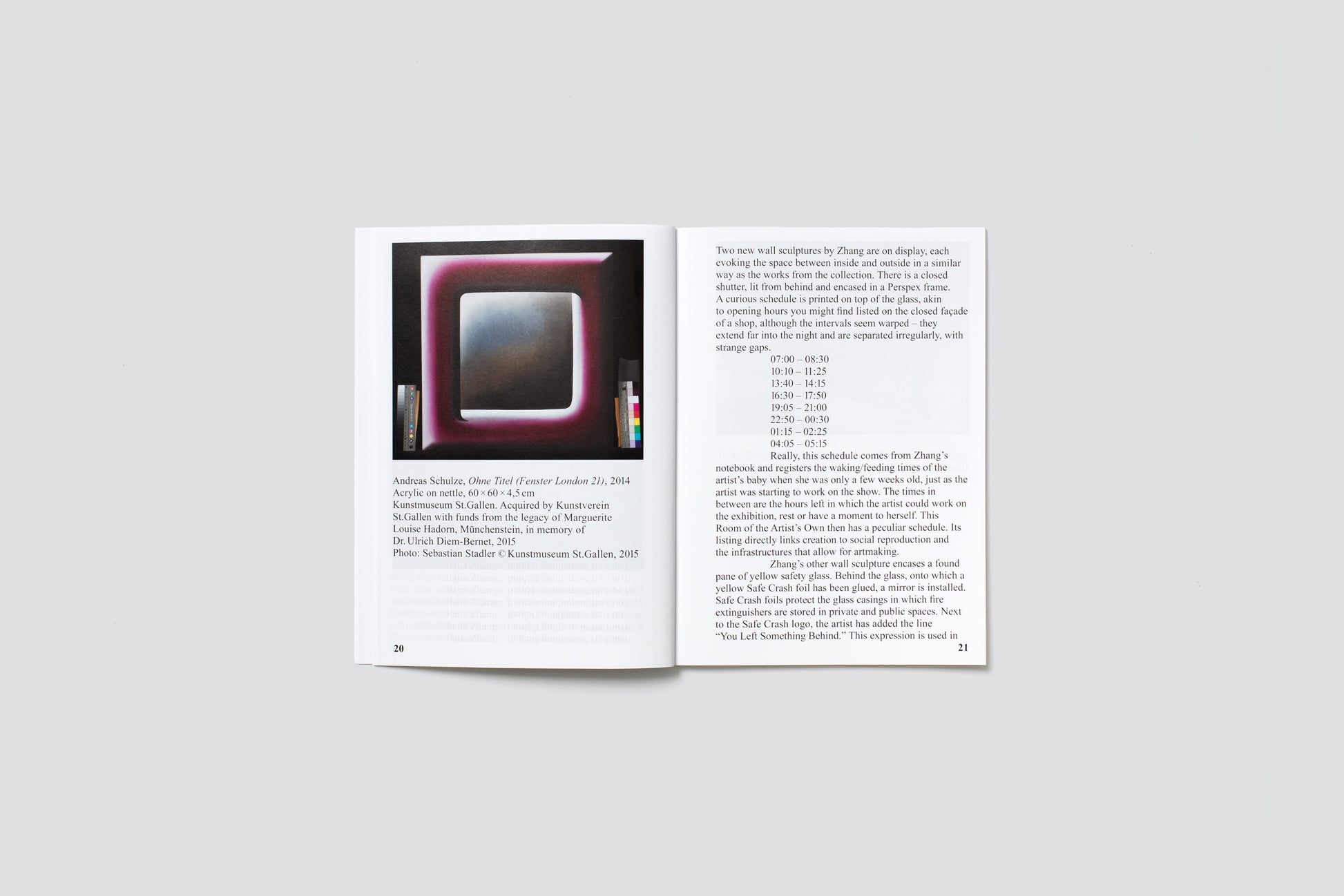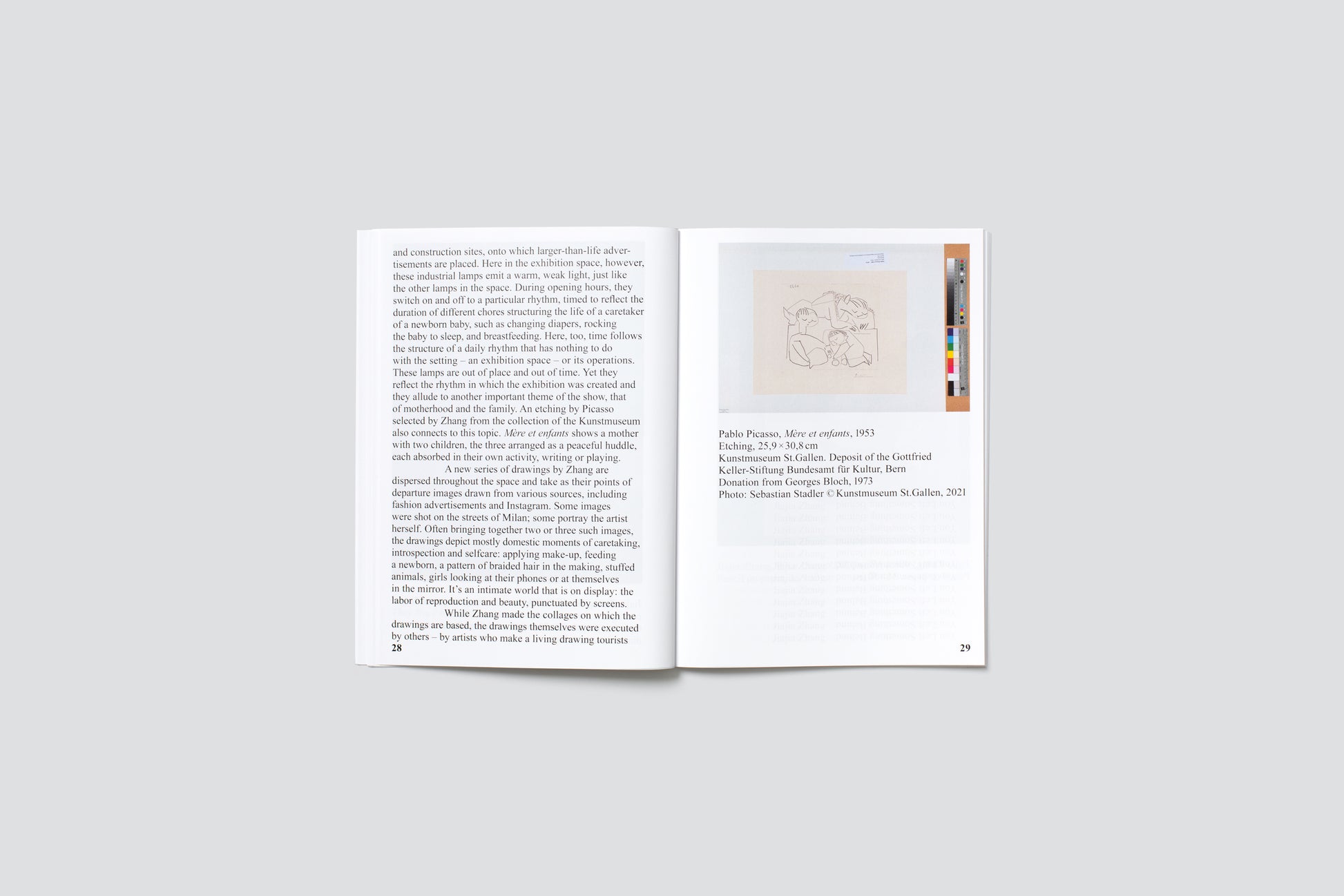 Published alongside the exhibition You Left Something Behind at Kunstmuseum St.Gallen (April 22 – October 1, 2023), the publication serves as an extended exhibition guide. Curator Melanie Bühler’s text introduces Jiajia Zhang’s practice and guides us through the works on display, followed by photographs taken by Jiajia Zhang during her residency in Milano between November 2022 and March 2023, while she was preparing the installation at Kunstmuseum. In this way, the book connects moments before, during and after the exhibition.