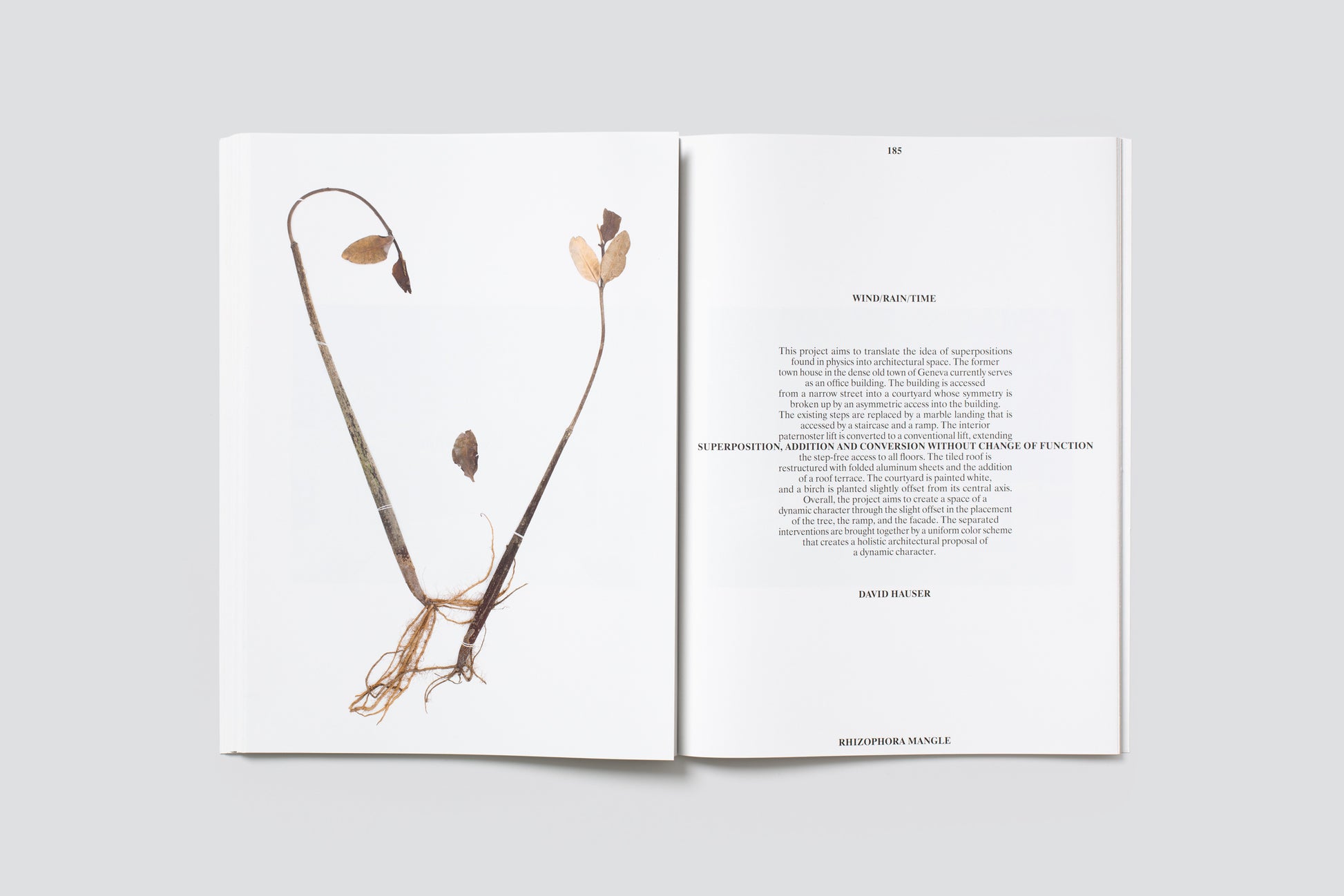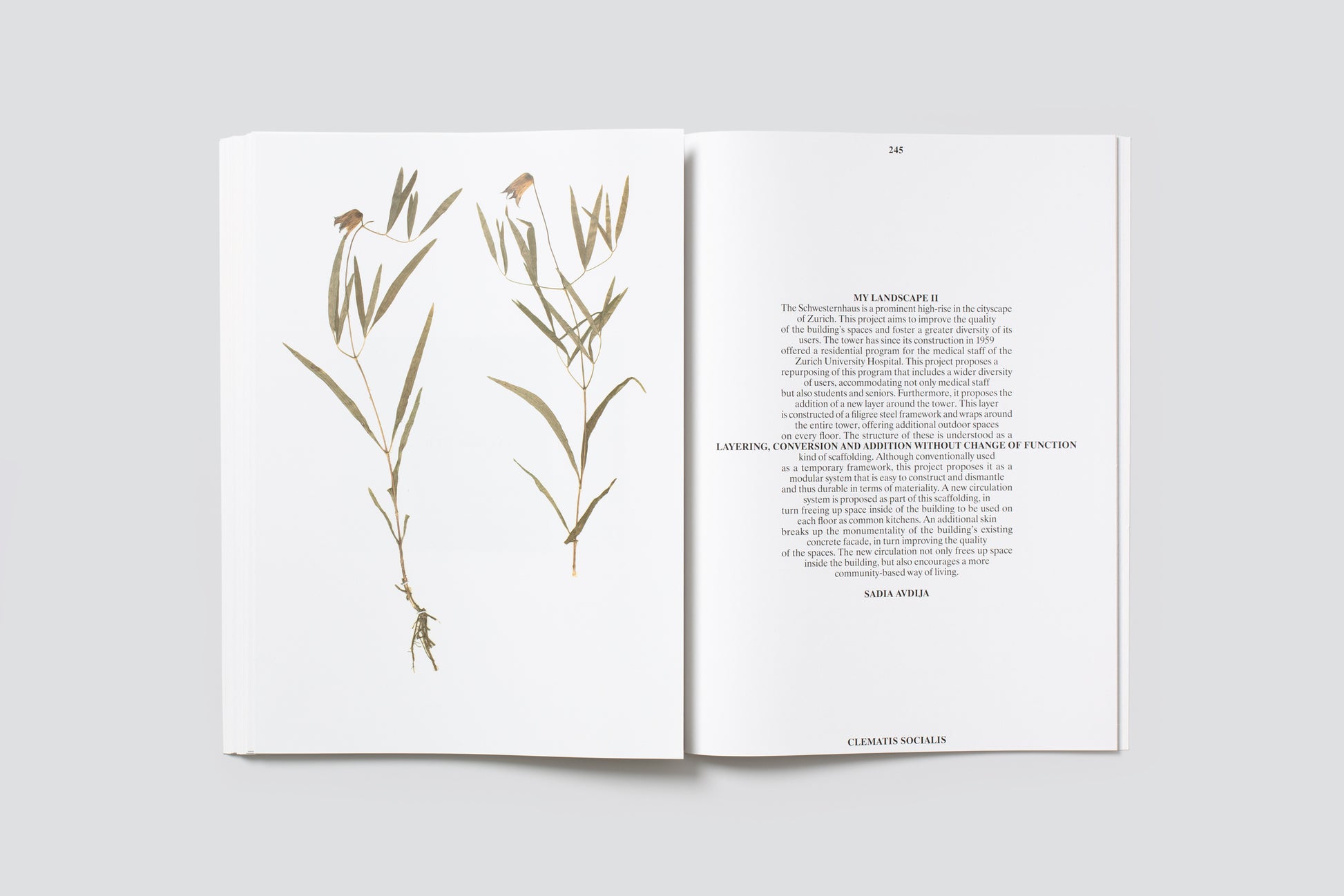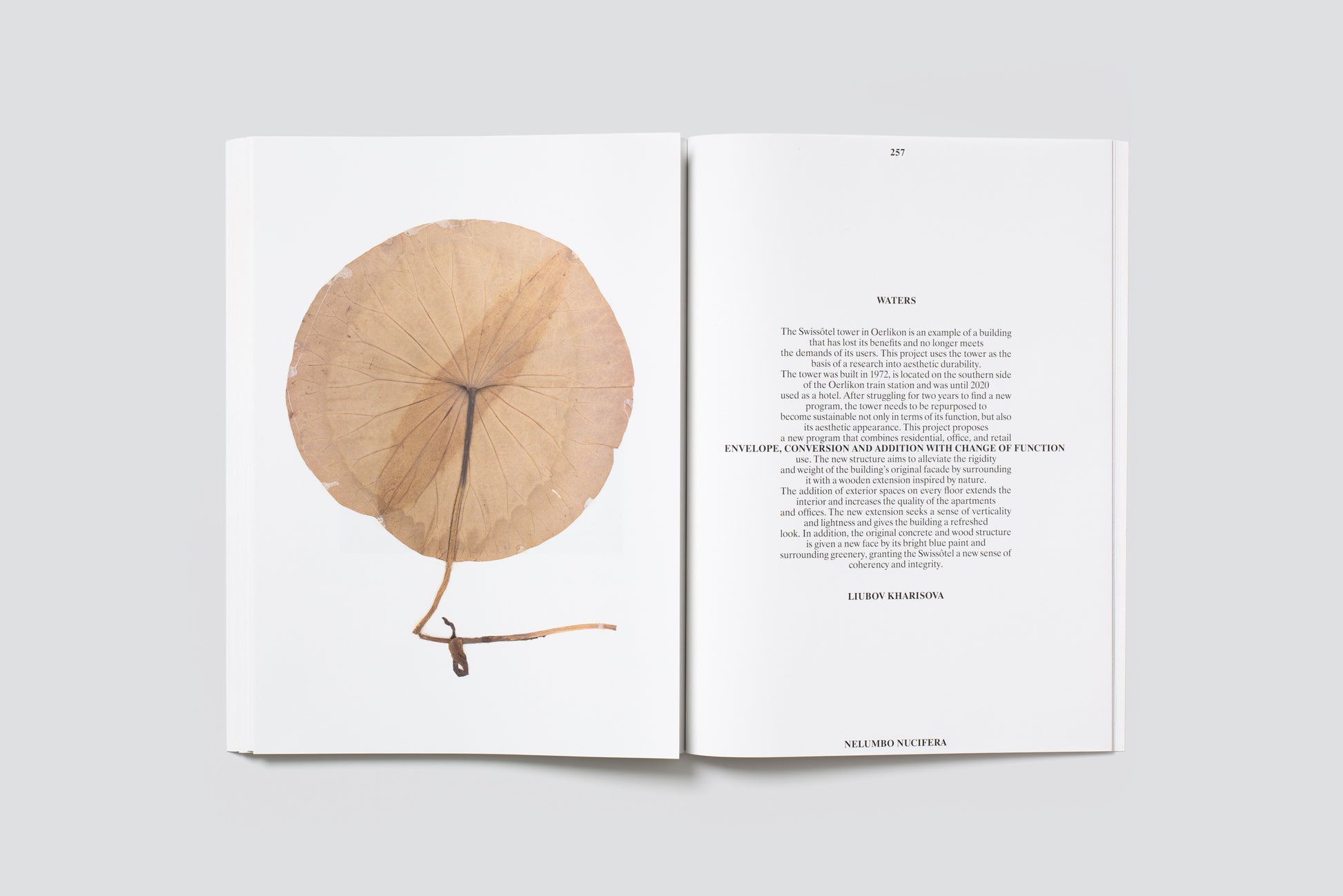 LEAVES contains the work of 23 students at the Swiss Federal Institute of Technology, all of whom have created individual architectural projects through the translation of a personal inspiration. The plans and renderings in this book were part of the university’s final exhibitions of 2020, 2021, and 2022. The works were created over four semesters by 3rd year Bachelor students, and 4th and 5th year Master students, including a number of Master theses. The world of plants has accompanied them as inspiration in both content and form. This includes its title—LEAVES—as a metaphor for the act of learning.