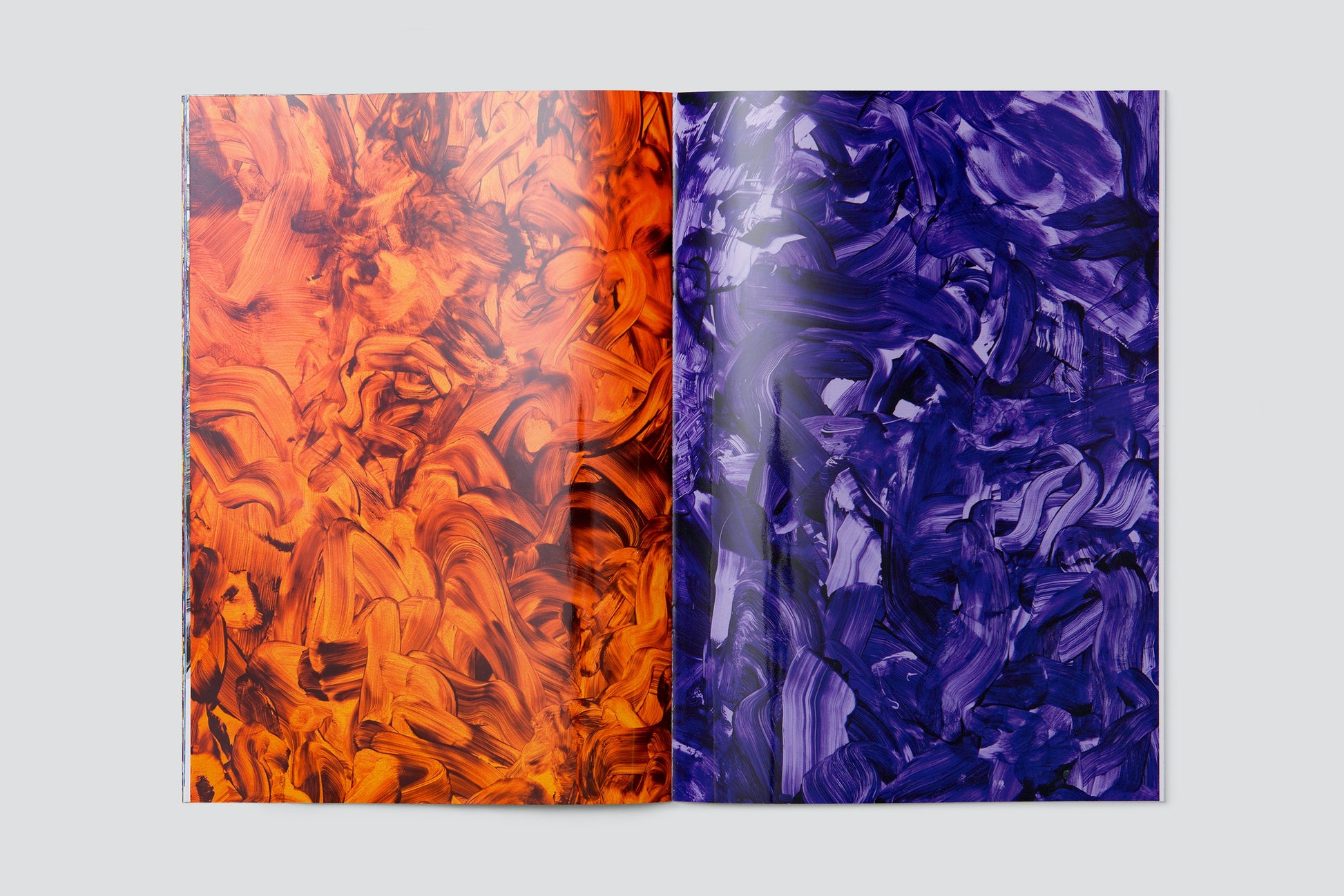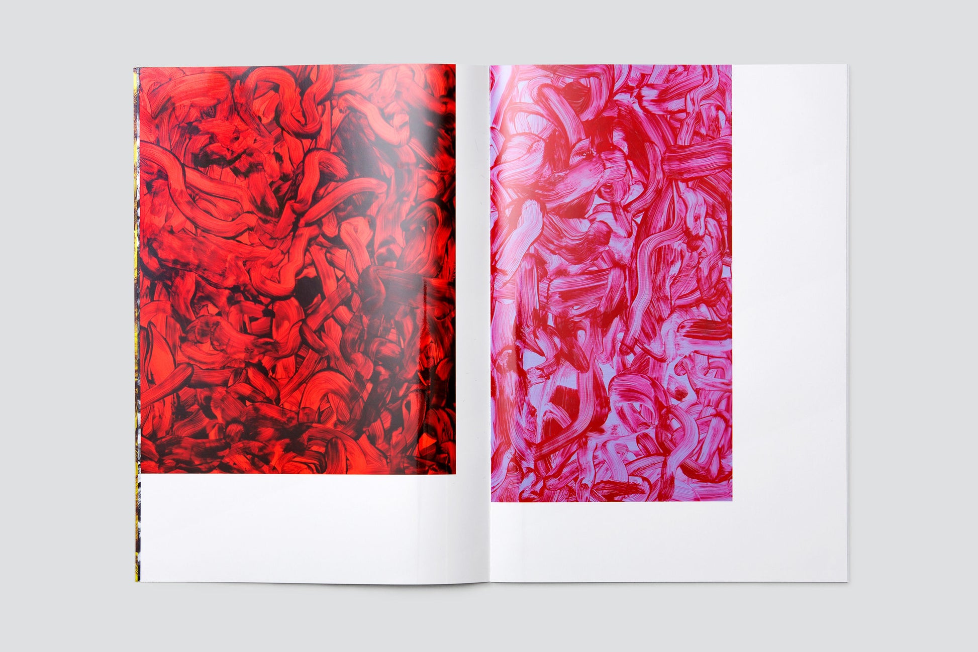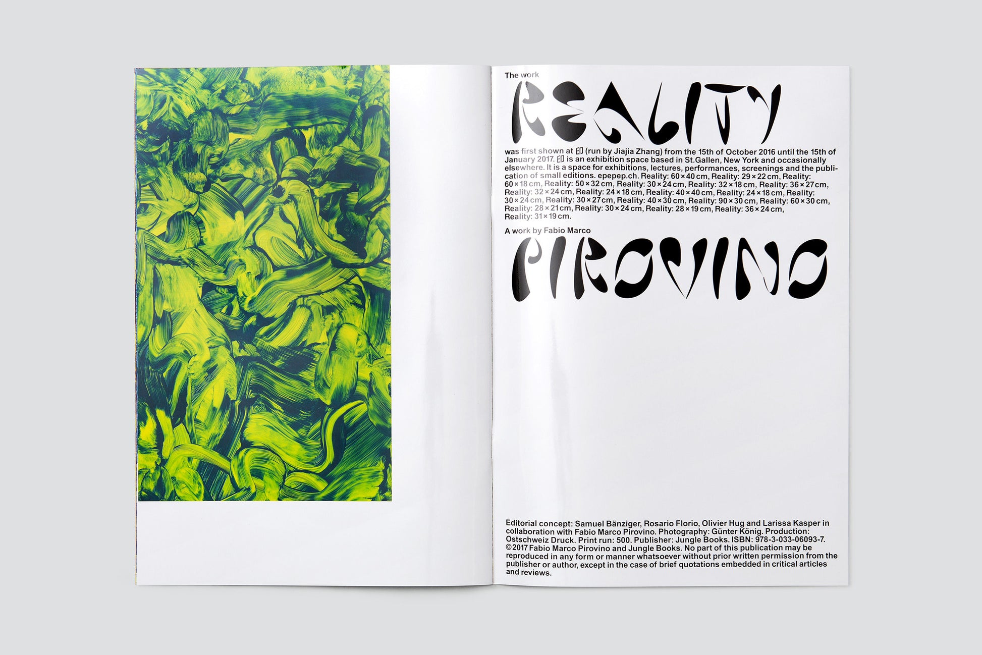 Fabio Marco Pirovino explores the boundaries and possibilities of imagery. For the exhibition Reality (15 October – 12 December 2016) at the art space epepep in St.Gallen, the artist realized a series of his typical “scribble paintings”: abstract, gestural paintings, layered traces as dormant records of dynamic processes. Pirovino painted twenty-one PVC films of different sizes, applying the monochrome paint directly with his hands and fingers. The artist nailed these object-like substrates to sprayed canvases with the painted side facing inward so that the surface of the works has a mirror-like appearance. The artist’s book Reality Pirovino is a continuation of the exhibition. The full-scale reproductions were cropped in the layout, and the canvases and nails are invisible. This captures the screen-like quality of the works, which is emphasized by the sheen of the book pages with a UV coating.