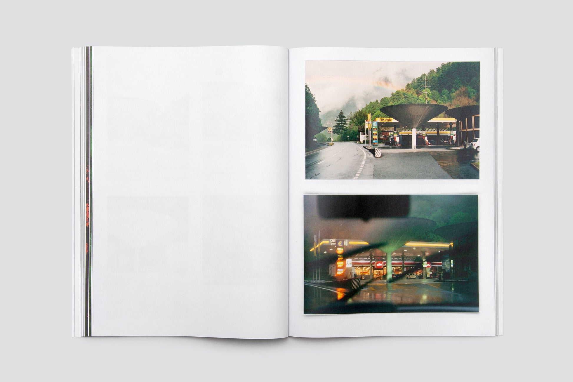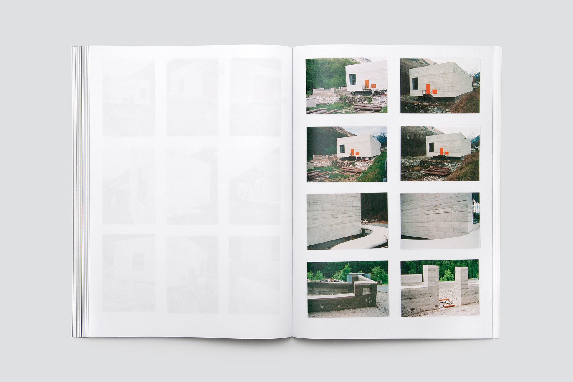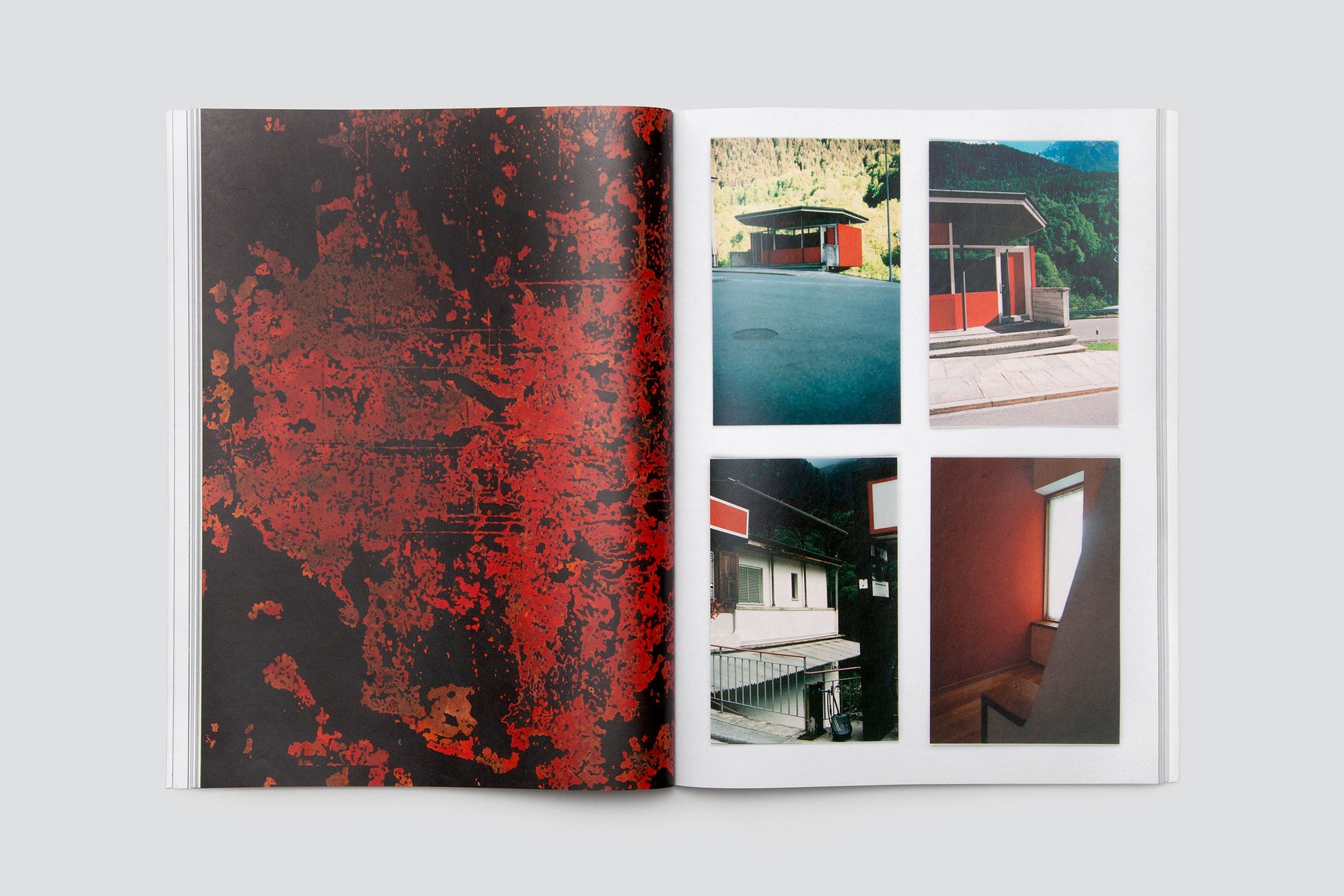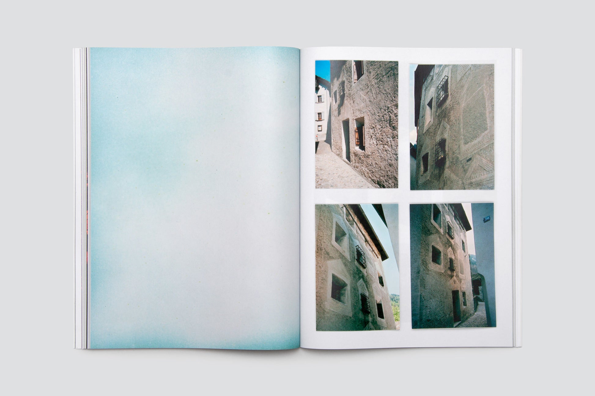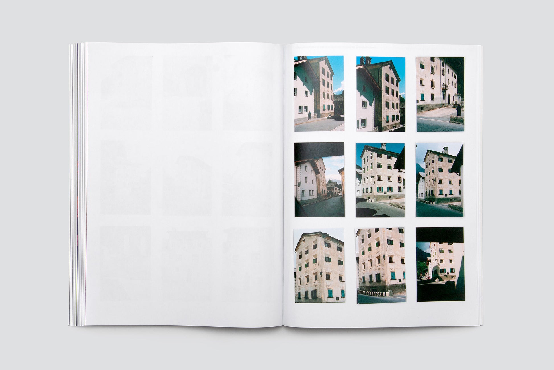 Over the past ten years, Katalin Deér has repeatedly spent time in the Val Bregaglia and taken photographs there. The result is an extensive collection of snapshots of different buildings and their unique presence in a landscape that is continuously moved and shaped by time and the forces of nature. The photos taken with an analogue camera appear in dense groups of two, four, eight, or nine pictures per page. Flat, green enameled copper plates, printed to the edge on both sides, continually interrupt the flow of the pages. In its surface and depth, the glassy, frozen surface created during the melting and cooling of the enameled plates is strangely similar to analogue photographic paper, and at the same time a snapshot that becomes what it is through an action. Like the photographic prints, the plates for the book were laid out and scanned directly. Inspired by the combination of the pictures (often repeated ones of the same buildings), the result is a complex and at the same time temporal interweaving and narrative: not an enumeration of architecture, but an emphatic view that focuses on things and turns to them, a tightrope walk. The book concludes with a text collage resulting from a conversation with Stephan Kunz on artistic questions in this process.